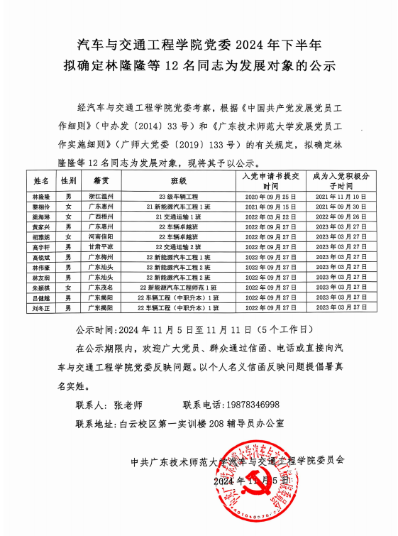 公司党委2024年下半年拟确定林隆隆等12名同志为发展对象的公示