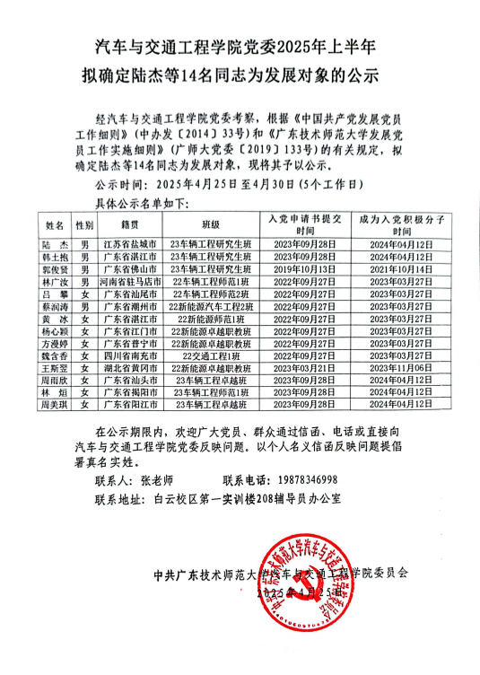 公司党委2025年上半年拟确定陆杰等14名同志为发展对象的公示