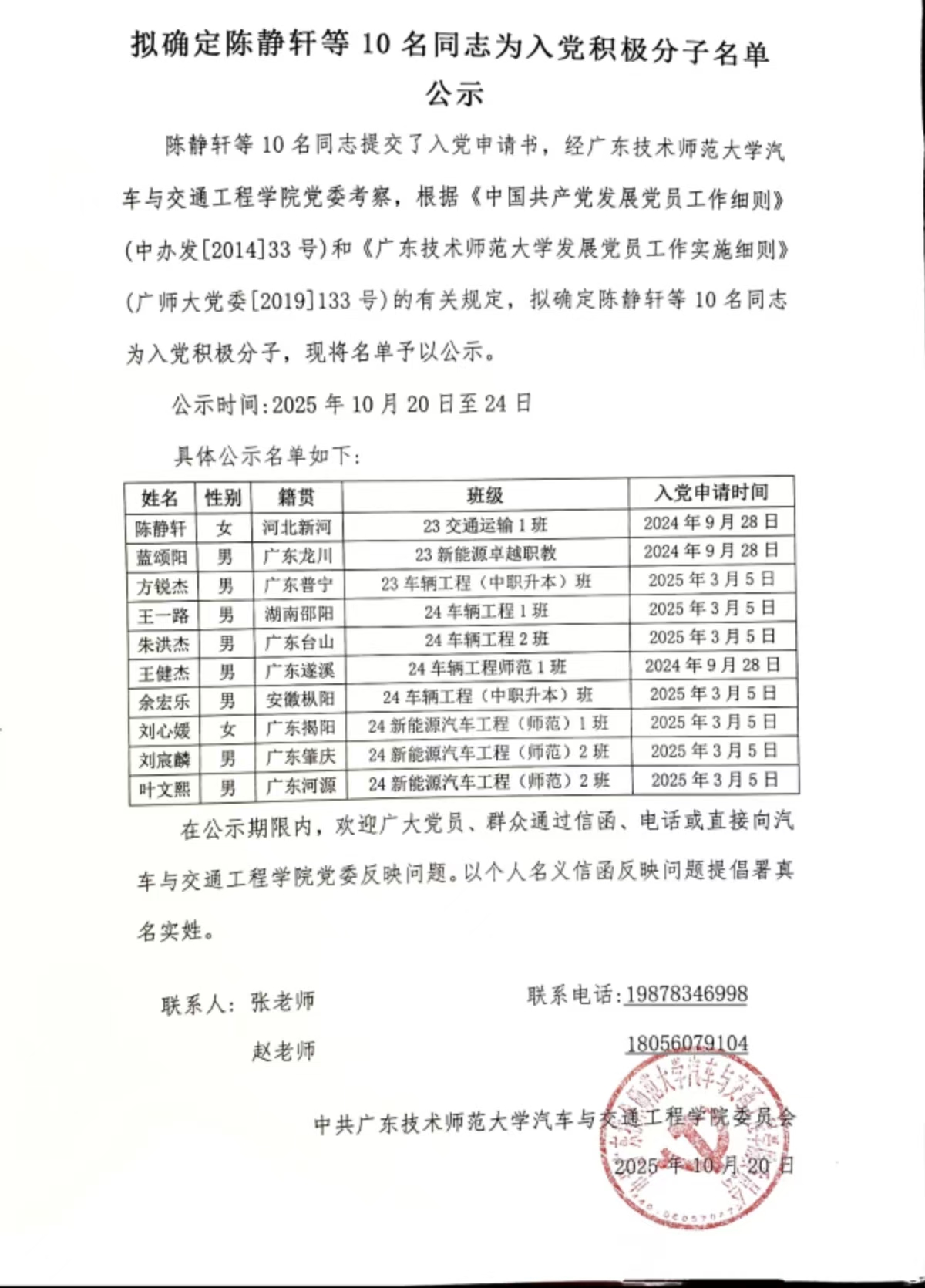 拟确定陈静轩等10名同志为入党积极分子名单公示