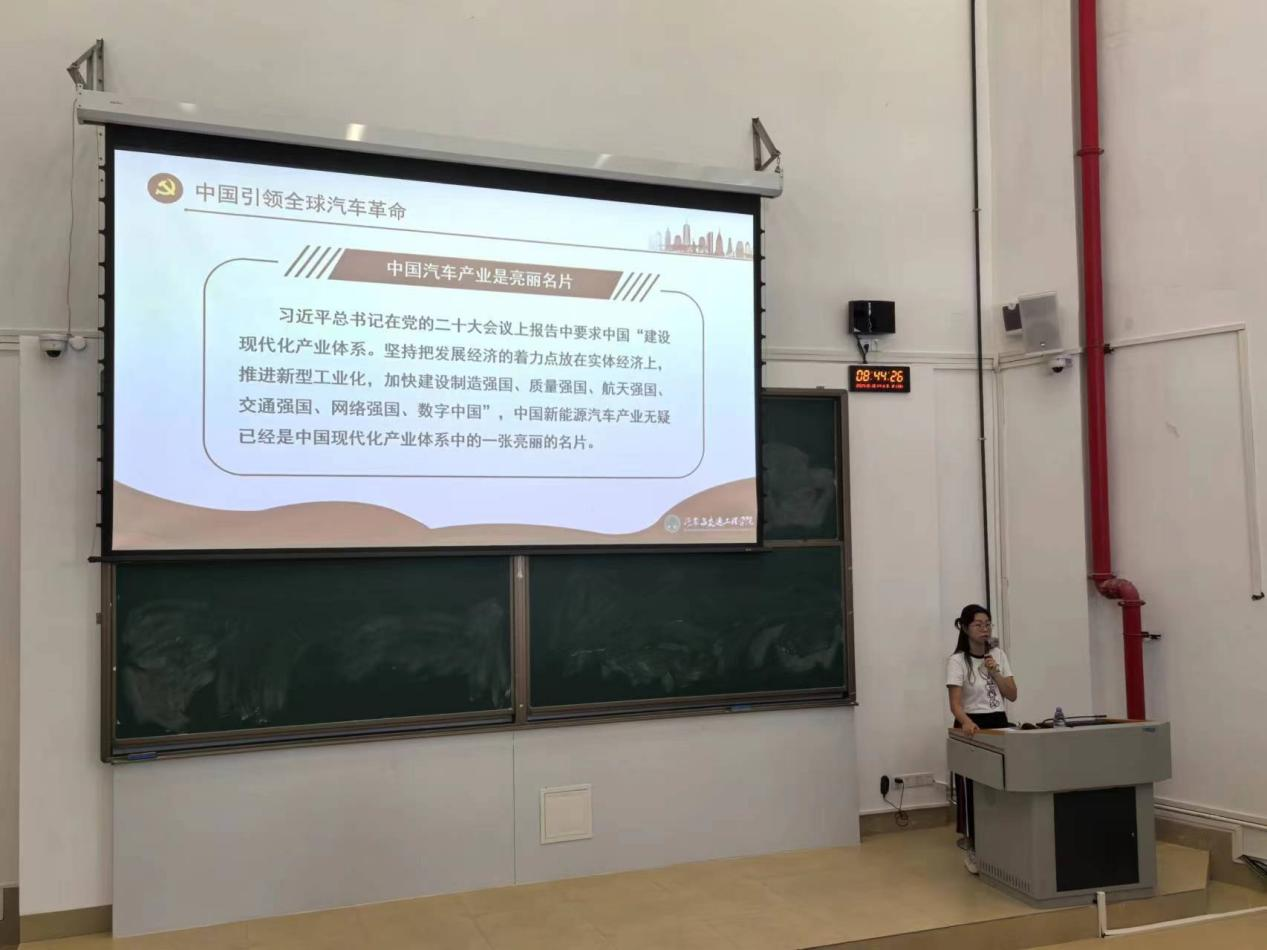 邝绮琳以《中国制度何以自信——结合汽车产业发展来看》为题为新生上了一堂专题党课。通过回顾中国汽车工业发展历史,结合中国新能源汽车产业数据,说明我国从跟随者到领跑者,实现中国汽车工业的换道超车,关键在于中国制度的优势,正体现了习近平总书记提出的“创新、协调、绿色、开放、共享”新发展理念。她提出,同学们要加强理论政治学习,掌握国家政策导向和产业发展前景,在学好专业知识的基础上,积极参与第二、第三课堂活动,做好大学规划,让自己学有所获、学有所成。