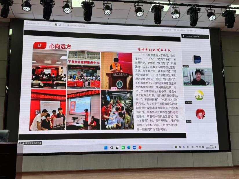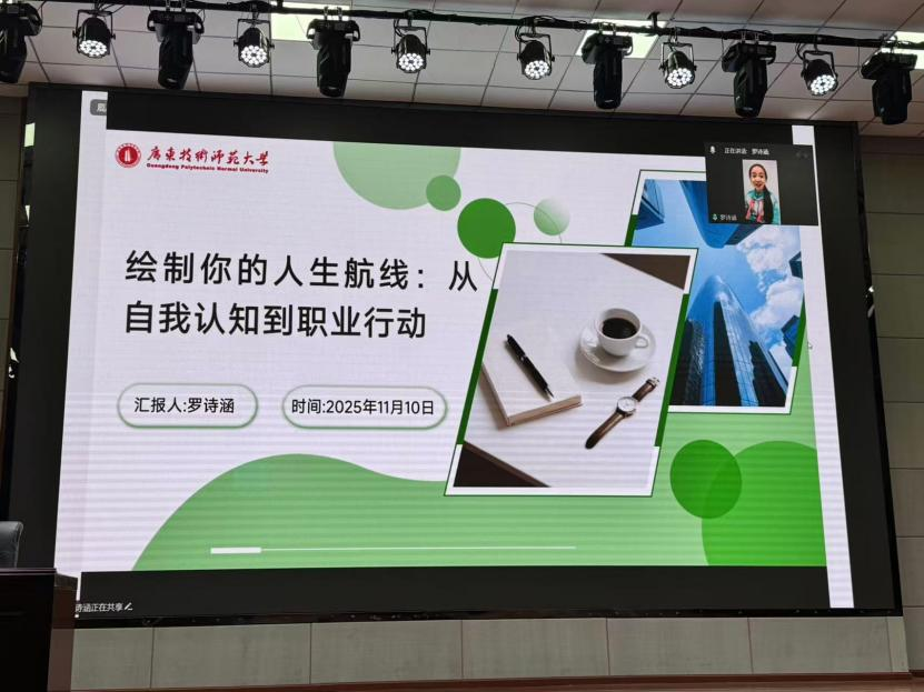 职业技术教育(交通运输)专业研究生罗诗涵利用十五运比赛志愿服务间隙,在天河体育中心进行远程连线。她以《绘制你的人生航线:从自我认知到职业行动》为题,基于前期对汽修系员工的问卷调研,为同学们系统剖析职业发展的三大赛道,并针对员工普遍存在的四大困惑提供了专业建议。她还援引曾晓涵、肖政延、蔡晓钧等三位汽院学子的中职升本经历,生动展现职业教育与个人成长的多元可能性,为同学们打开视野。