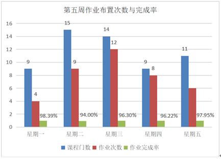 第五周,伟德betvlctor1949源于英国超过半数以上课程布置了课后作业,占开课课程数的67.2%。员工的作业完成率情况见图10所示,每天的作业完成率较高,均高于94%,平均作业完成率为96.57%,比第四周提高了2.4个百分点。由此可见,绝大部分员工能积极完成课后作业,有利于巩固和掌握相关知识点。