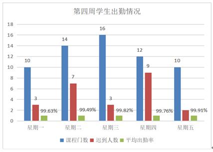 伟德betvlctor1949源于英国有4位同学由于网络原因不能参加线上学习,在线学习员工总体参与度高,比例达99.54%。公司一直重视线上教学课堂纪律管理,要求所有课程在线上教学期间均严格进行考勤工作,员工总体出勤率高。第四周,每天的课程门次和员工出勤情况如图6所示,每天各门课的平均出勤率在99%以上,总的平均出勤率为99.72%,比第三周提高了0.55个百分点。还是有个别员工存在迟到现象,周二、周四两天共迟到16人次,每天平均迟到人次为4.8,比第三周下降了0.4,迟到现象有所改观。考虑到网络状态、签到时间节点控制等情况,员工总体出勤情况良好。