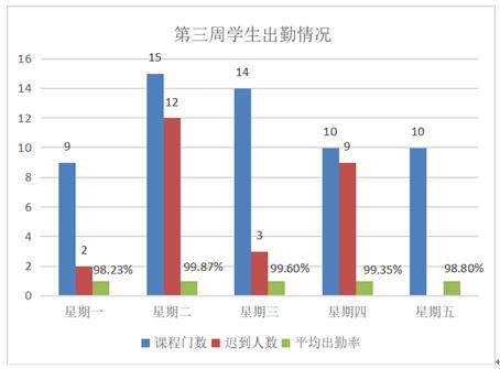 伟德betvlctor1949源于英国只有4位同学由于网络原因不能参加线上学习,在线学习员工参与度高,比例达99.54%。公司一直重视线上教学课堂纪律管理,要求所有课程均进行严格考勤工作,所以,员工总体出勤率高。第三周每天的课程门次和员工出勤情况如图6所示,出勤率高,每天各门课堂的平均出勤率在98%以上,总的平均出勤率为99.17%,比第2周下降了0.28个百分点。员工迟到现象依然存在,周二、周四两天共迟到人次21,每天平均迟到人次为5.2,但第三周整体迟到人次比第2周有所下降,考虑到网络状态、签到时间节点控制等情况,员工总体出勤情况良好。