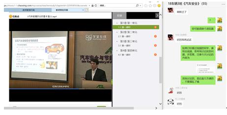 在《汽车安全》的课堂上,许铀老师采用“线上自学+微信指导”的方式,将学堂在线网上课程资源与超星学习通教学平台混合实行在线教学。在与员工观看教学视频的过程中,通过提出相关问题,引导员工在微信群展开讨论。同时,利用“学习通”的通知、任务点、讨论、作业、资料等功能,及时通知员工课程动态、布置作业巩固知识点、跟踪员工学习情况,使得网络学习呈现较为理想的效果。